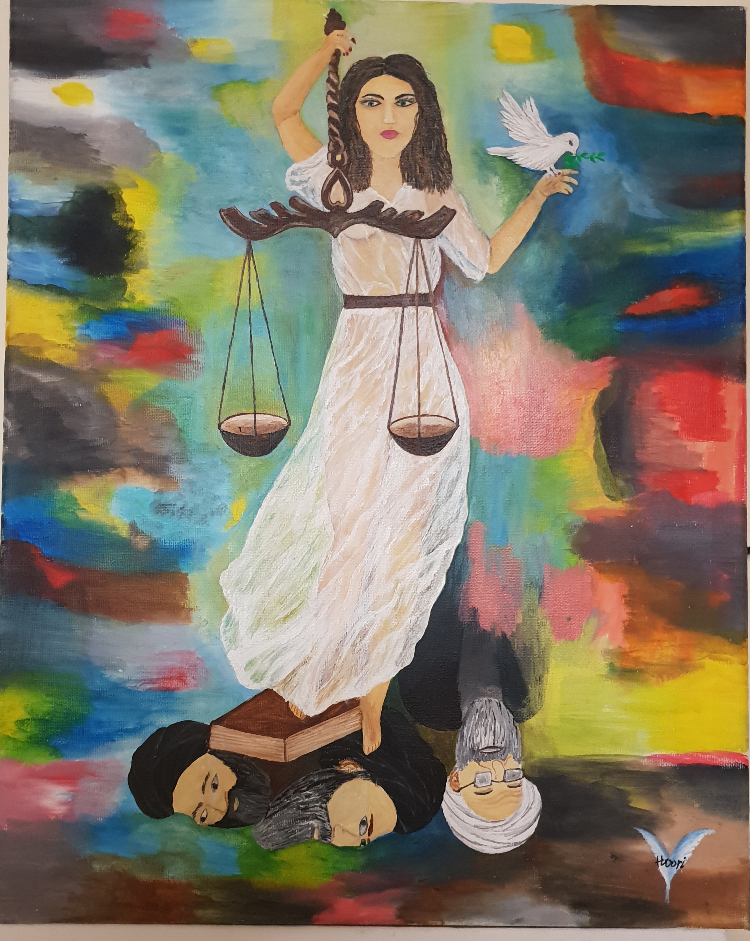فرشته عدالت که ترازویی در یک دست دارد و پرنده صلح در دست دیگر او است با مبارزه متداوم زنان و مردان ایرانی و زیر پا گذاشتن کتاب خرافات و قانون برگرفته از این کتاب اسلامی سراسر خرافی و مجریان این قانون ضد بشری که سالهاست در دست آخوندهای خونخوار است عدالت به دست زنان و مردان آزادیخواه اجرا خواهد شد